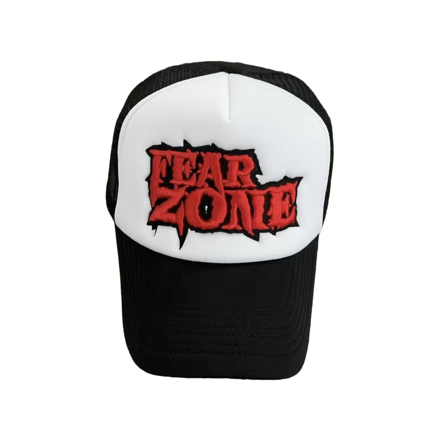 This two-tone trucker hat features a bold embroidered Fear Zone logo in blood-red stitching across the structured white front panel, contrasted with a black bill and mesh back for a breathable fit. The 3D embroidery adds texture and depth, making the design pop.